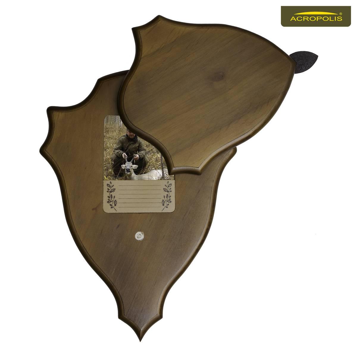 Подвійна мала декоративна дерев’яна дошка для трофеїв. Під відкидною кришкою можна розмістити фотографії та опис з місця полювання. Відкидна кришка утримується магнітною застібкою. Багатошарове лакування.